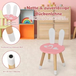 Dieses Set ist eine wundervolle Ergänzung für Kinderzimmer und ein tolles Geschenk.Mit den Hasenohren wirkt es sehr süß und zieht die Aufmerksamkeit der Kinder sofort auf sich. Die Holzkonstruktion ist langlebig und sehr stabil. Zudem gewährleisten die rutschfesten Untersetzer die Stabilität. Außerdem eignet sich die große Oberseite für alle möglichen Alltagsdinge, während die Schublade zusätzlichen Platz für Accessoires, Sticker, Schmuck usw. bietet.Im Lieferumfang befindet sich zudem ein Stuhl mit Hasenohren. Wenn Sie noch nach einem solchen Set suchen, dann zögern Sie nicht länger und schlagen Sie jetzt zu!