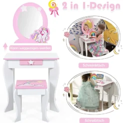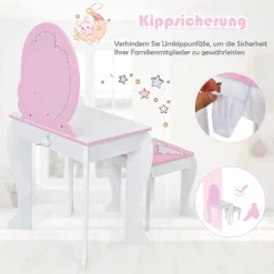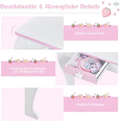 Mit dem klaren Spiegel helfen dieser Kinder Schminktisch und Hocker mit niedlichen Mustern Ihrem Mädchen, den Traum einer Prinzessin zu verwirklichen, da sie sich hier schminken und ankleiden kann. Sie können denSpiegel abnehmen, wenn Ihre Kinder sich auf das Zeichnen oder Schreiben konzentrieren müssen. Nach dem Schminken oder Lernen gibt es eine praktische Schublade mit reichlich Platz, um die Sachen aufzubewahren und die Tischplatte sauber und ordentlich zu halten. Mit der Anleitung gelingt der Zusammenbau schnell. Die glatte Oberfläche lässt sich leicht mit einem feuchten Tuch reinigen.