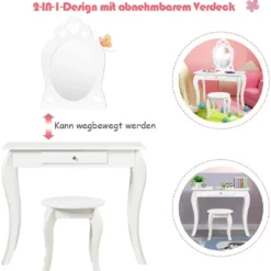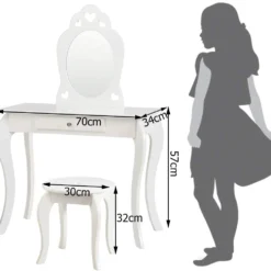 Fragen Sie sich, was Sie ihrem Kind zum Geburtstag oder zu Weihnachten schenken sollen? Unser kinder Schminktisch ist das perfekte Geschenk für Ihr kleines Mädchen. Hergestellt aus hoch verdichteten Brettern und Kiefernholz, ist das gesamte Set sehr stabil und kann über einen langen Zeitraum hinweg verwendet werden. Zusätzlich sind die abgerundeten Ecken und die anti-rutsch Unterlagen nur zwei der Arten, wie wir unseren Schminktisch kindersicher gemacht haben.