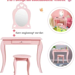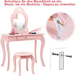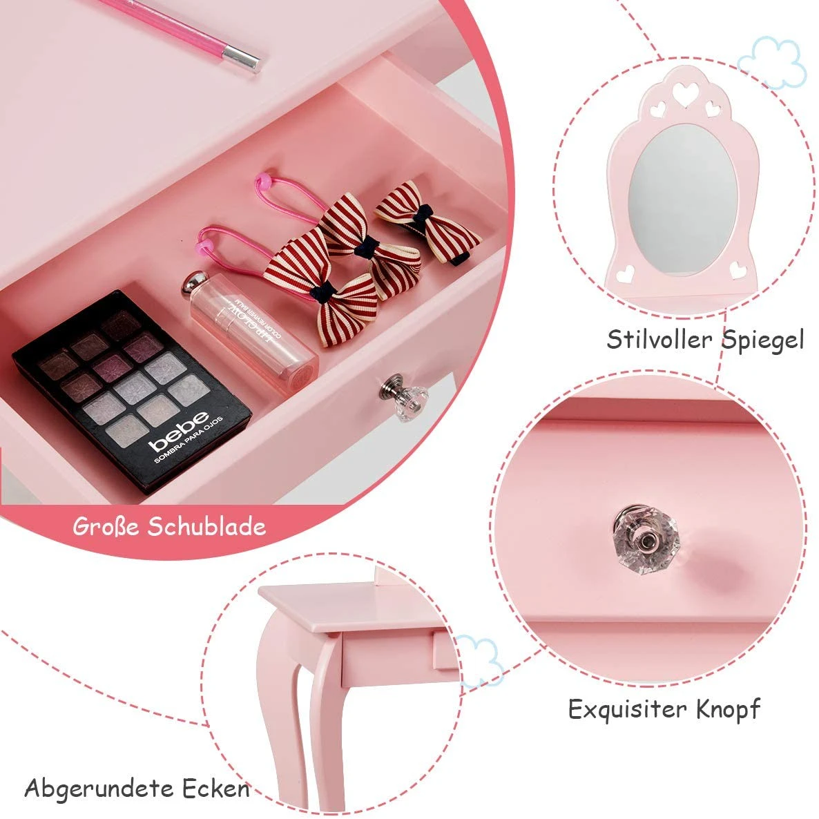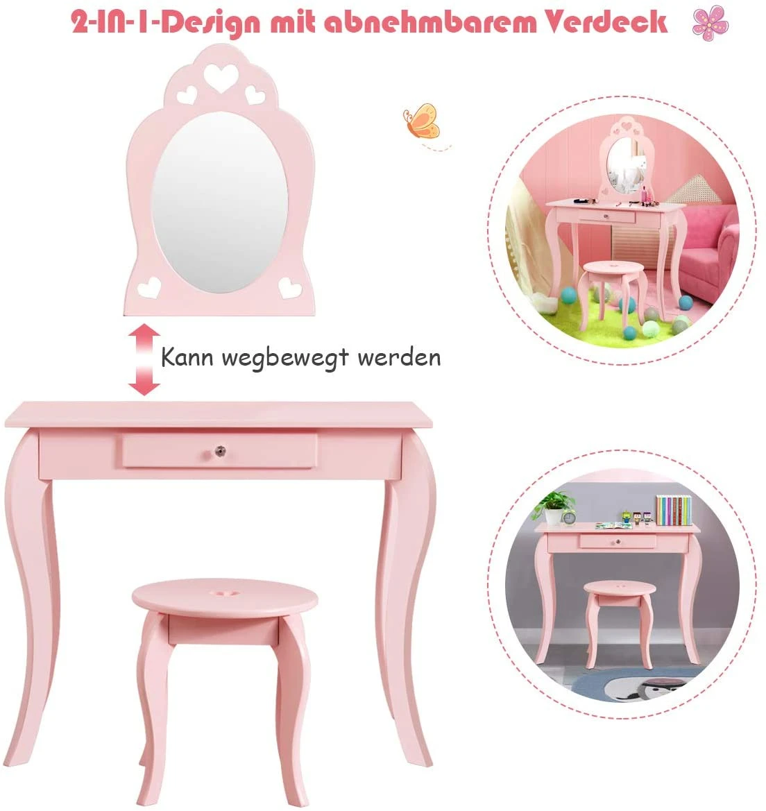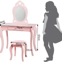 Fragen Sie sich, was Sie ihrem Kind zum Geburtstag oder zu Weihnachten schenken sollen? Unser kinder Schminktisch ist das perfekte Geschenk für Ihr kleines Mädchen. Hergestellt aus hoch verdichteten Brettern und Kiefernholz, ist das gesamte Set sehr stabil und kann über einen langen Zeitraum hinweg verwendet werden. Zusätzlich sind die abgerundeten Ecken und die anti-rutsch Unterlagen nur zwei der Arten, wie wir unseren Schminktisch kindersicher gemacht haben.