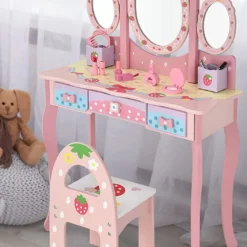 Dieses Set mit klappbarem Spiegel ist eine wundervolle Ergänzung für Kinderzimmer.Die exzellenteMDF-Konstruktion bietet Ihnen Stabilität und Sicherheit.Auf der großen Oberseite und in den 3 Schubladen ist viel Platz für alle möglichen Gegenstände.Zwei Teile des Spiegels können zudem eingeklappt werden, wodurch er sehr praktisch ist.Natürlich können Sie ihn auch vollständig abnehmen und den Tisch dadurch in einen Schreibtisch verwandeln. Sollten Sie noch nach einem solchen Set suchen, dann schlagen Sie jetzt zu!