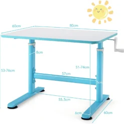 Dieser Kinderschreibtisch hat ein höhenverstellbares Design und ist daher sehr praktisch. Seine Höhe kann von 53-76 cm eingestellt werden. Das gelingt ganz einfach und mühelos mit der Handkurbel. An der Seite des Tisches gibt es einen praktischen Haken, an dem die Schultasche aufgehangen werden kann. Die kratzfeste Oberfläche ist glatt und blendet die Kinderaugen nicht. Außerdem ist sie wasserfest und leicht zu reinigen. Der robuste Stahlrahmen gewährleistet die Gesamtstabilität des Tisches.