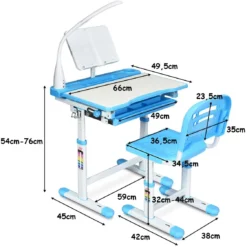 Unser praktscher Kinderschreibtisch gibt es drei schöne Farbe Grau, Blau und Rosa. Der höhenverstellbar Tisch ist perfekt für wachsende Kinder geeignet. Die Arbeitsfläche ist neigbar und ideal für verschiedene Lernaktivitäten. Unter der Tischplatte ist ein Schubfach integriert, hier finden Stifte und Kleinigkeiten einen guten Platz für Ordnung im Kinderzimmer. Der Schülerschreibtisch hat noch einen Leserahmen und eine Lampe.