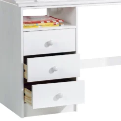 - Der Schreibtisch ist aus massivem Kiefernholz gefertigt welches aus nachhaltiger Forstwirtschaft stammt und mit schadstoffarmem und lösemittelfreiem Lack behandelt und in weiß lackiert.