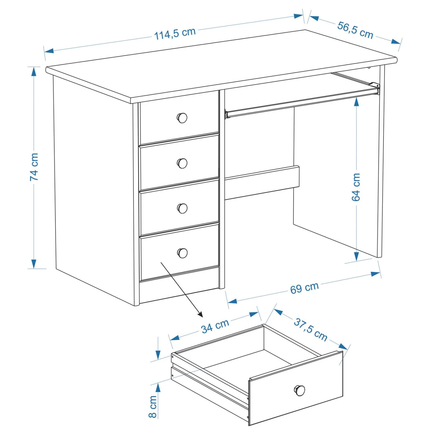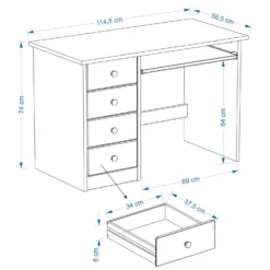 macht das Lernen und Arbeiten viel Spaß. Die Arbeitsplatte bietet ausreichend Platz und für die Tastatur ist ein extra Auszug vorgesehen. In den 4 Schubladen lassen sich prima die Schulsachen und andere Arbeitsmaterialien verstauen.
