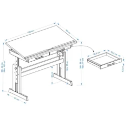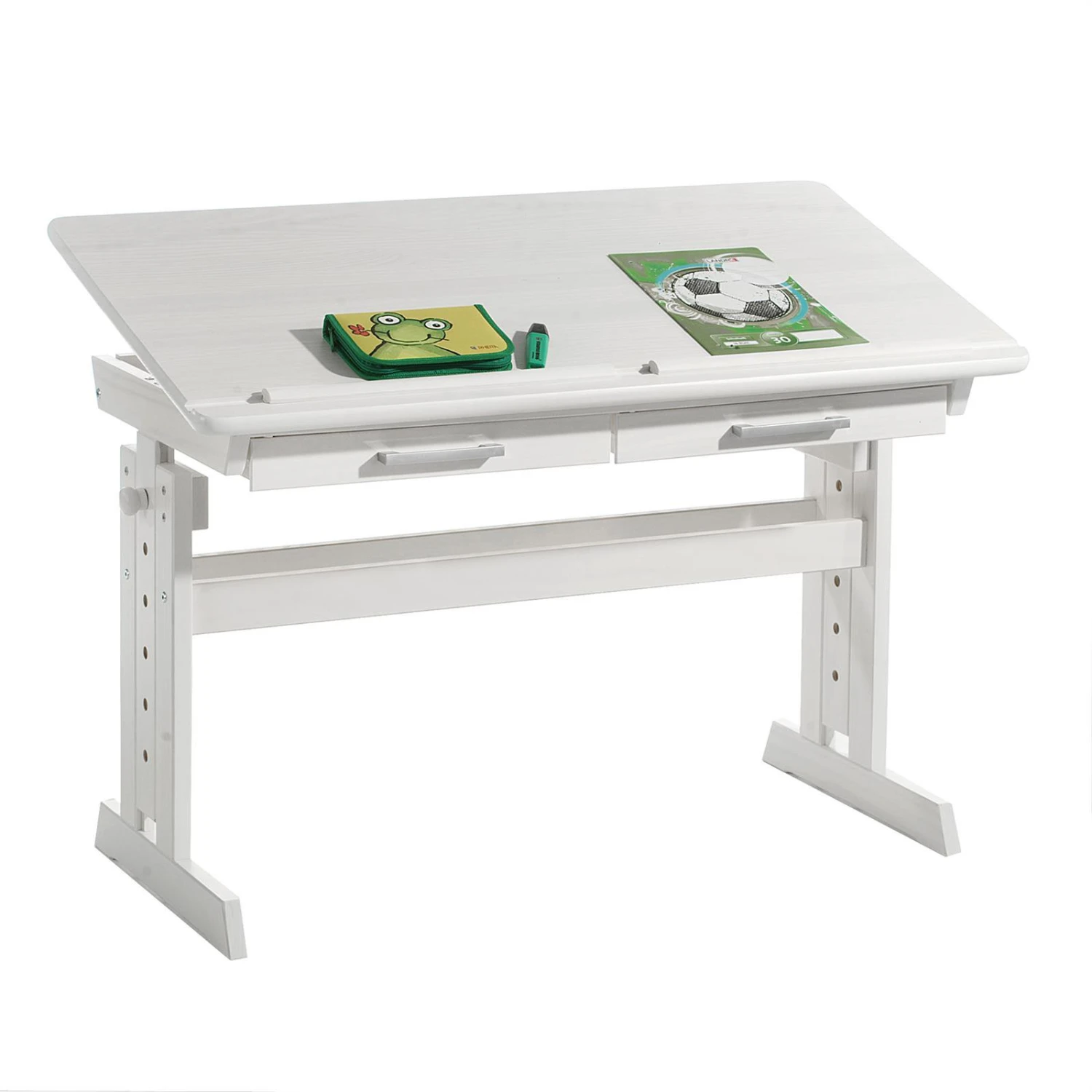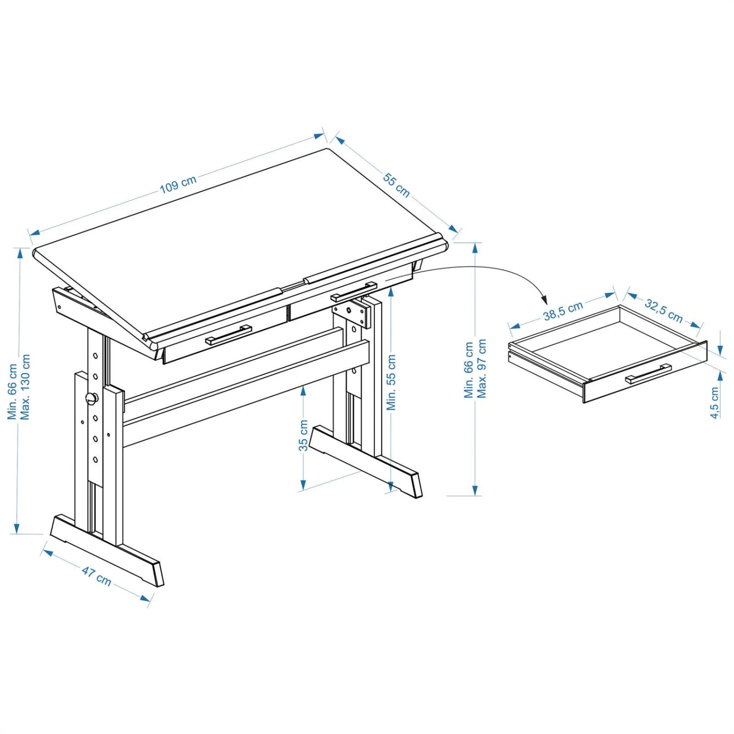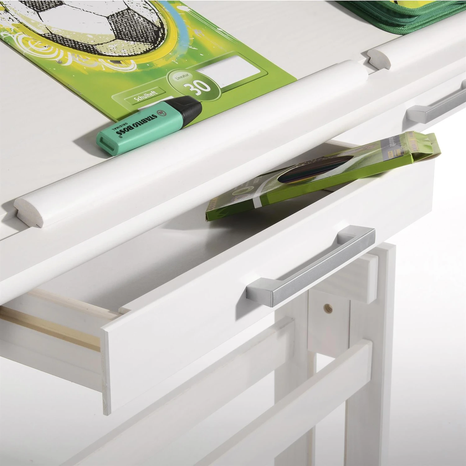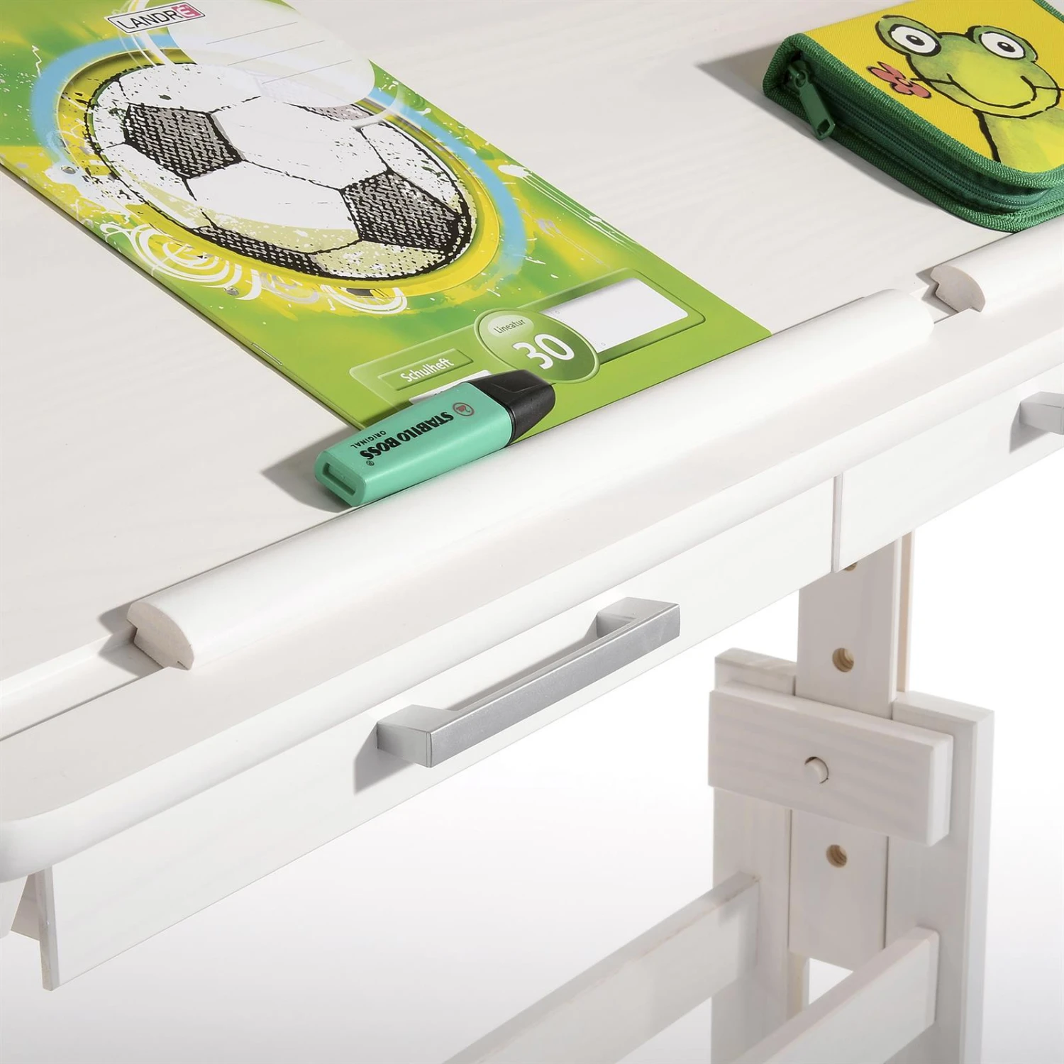 ist der ideale Schreibtisch zum Schulanfang. Durch die Höhenverstellung passt er sich der Körpergröße Ihres Kindes optimal an, so dass eine ergonomische Arbeitshaltung ermöglicht wird! Vielen Kinder wird das Schreiben und Zeichnen auch erleichtert, in dem man die Arbeitsplatte etwas neigt. Die Neigung der Arbeitsplatte lässt sich mit einem Handgriffen einstellen. Eine komplett flache Neigung mit 0° ist natürlich auch möglich. Der Schülerschreibtisch bietet durch 2 breite Schubladen Stauram für Schreibutensilien. Die Stiftablage verhindert, dass Stifte auch bei geneigter Tischplatte nicht vom Tisch rollen.