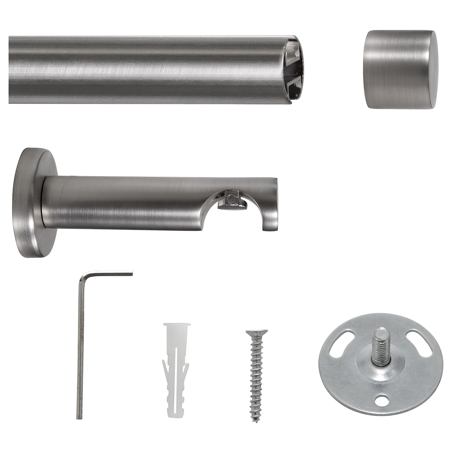 - Lieferumfang: 1 mydeco® Innenlauf, 2 Endstücke cap, 3 Träger, 24 Gleiter, Dübel, Schrauben